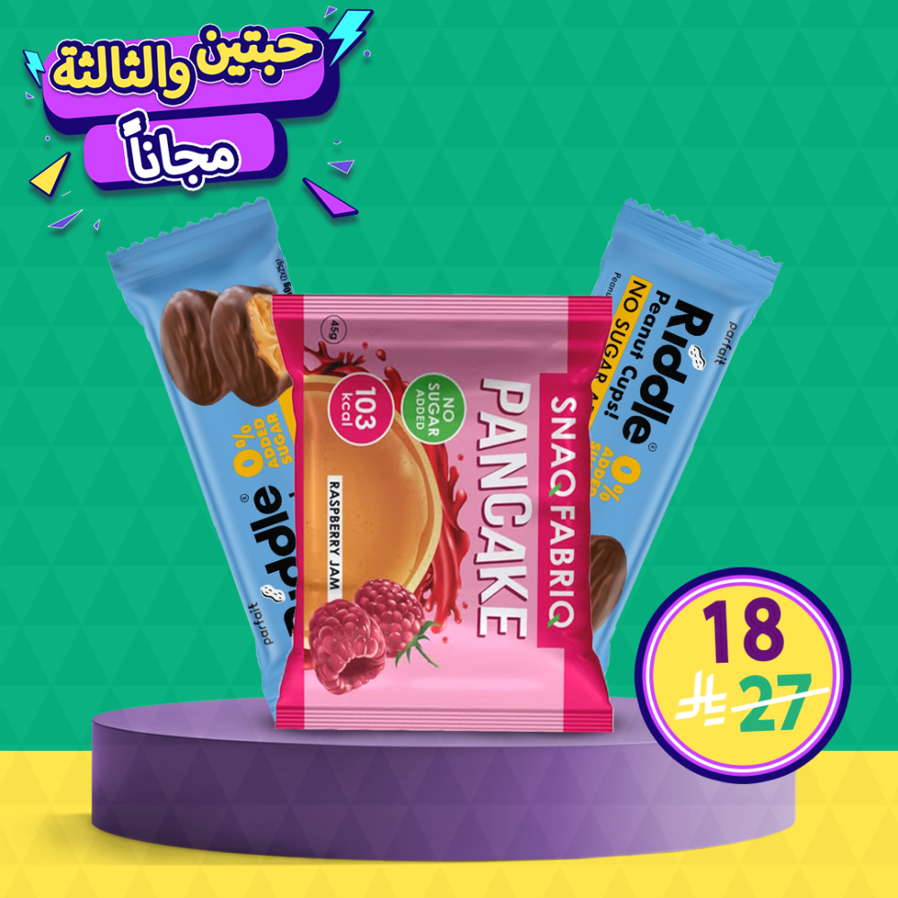 عرض (2  ريدل أكواب زبدة الفول السوداني بدون سكر 50 جم  + 1 سناك فابريك بان كيك مربى توت 45 جرام)